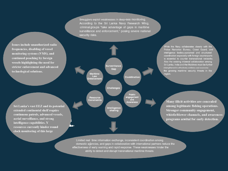 To effectively counter emerging maritime threats, Sri Lanka must adopt a long-term and technologically integrated strategy. Strengthening Maritime Domain Awareness (MDA) is essential, and the Sri Lanka Navy can enhance surveillance by deploying UAVs and drones for continuous monitoring, use of SLAF support for coastal surveillance, utilising satellite-based systems for long-range vessel tracking, and incorporating AI-driven analytics for predictive threat assessment and abnormal vessel behaviour detection.